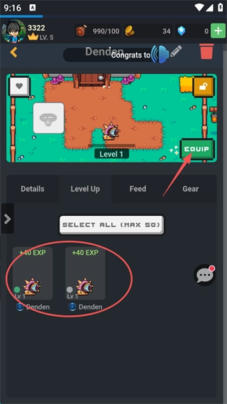 7、宠物可以通过打怪升级,也可以点击屏幕右侧偏上的“EQUIP”装备宠物。