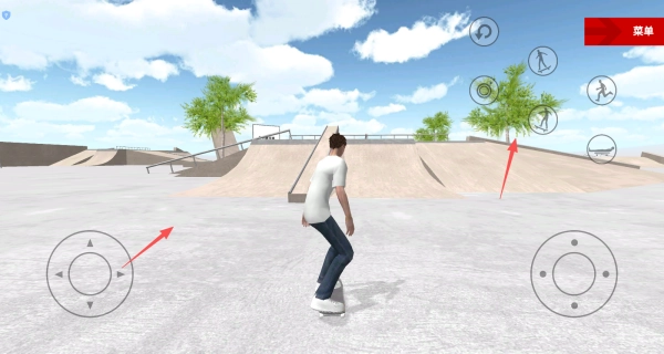 打开游戏进入后,通过滑动左右两侧的虚拟摇杆来操控角色移动,点击右上角的按钮则能让角色做出各式各样的特技动作。
