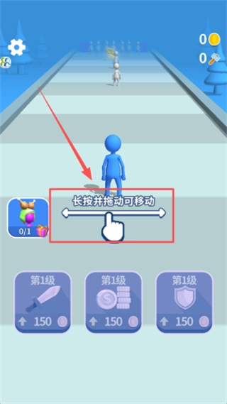 长按屏幕上的蓝色小人并拖动,即可控制其移动;移动过程中要留意收集路上的钥匙和金币,同时需灵活运用底部的三个150级技能按钮来发起攻击。