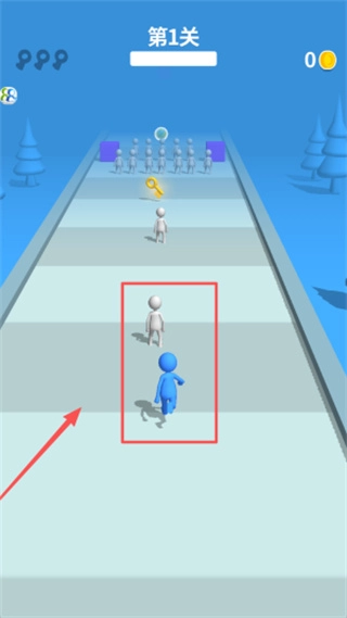操控蓝色小人靠近拿着钥匙的白色小人,依据红色箭头的指示完成接触就能得到钥匙道具。