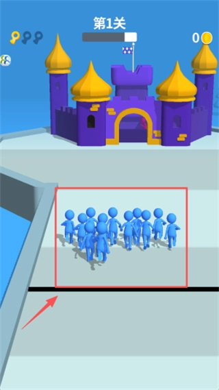 带领蓝色小人军团朝着紫色城堡进发,按照左下角红色箭头的方向指引去攻占目标城堡。