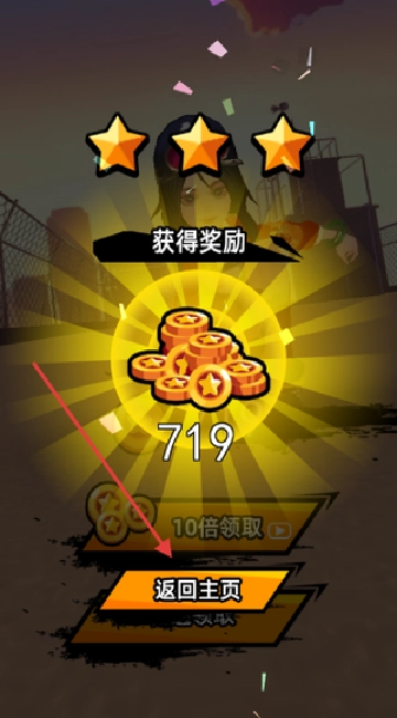 完成关卡后会得到金币奖励,点击返回主页就能继续挑战新关卡,或者查看游戏的其他功能内容。