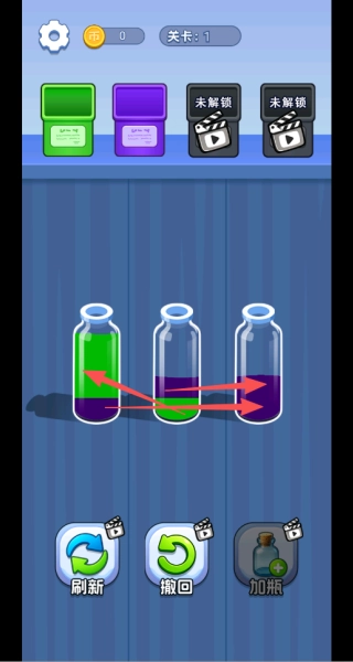 合理运用加瓶道具,若当前瓶子无法满足分类所需,可解锁临时空瓶,以此突破空间局限。