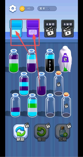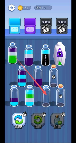 遇到关卡卡住的情况,可点击下方的刷新、撤回或加瓶功能按钮,调整操作思路,帮助完成颜色分类任务。