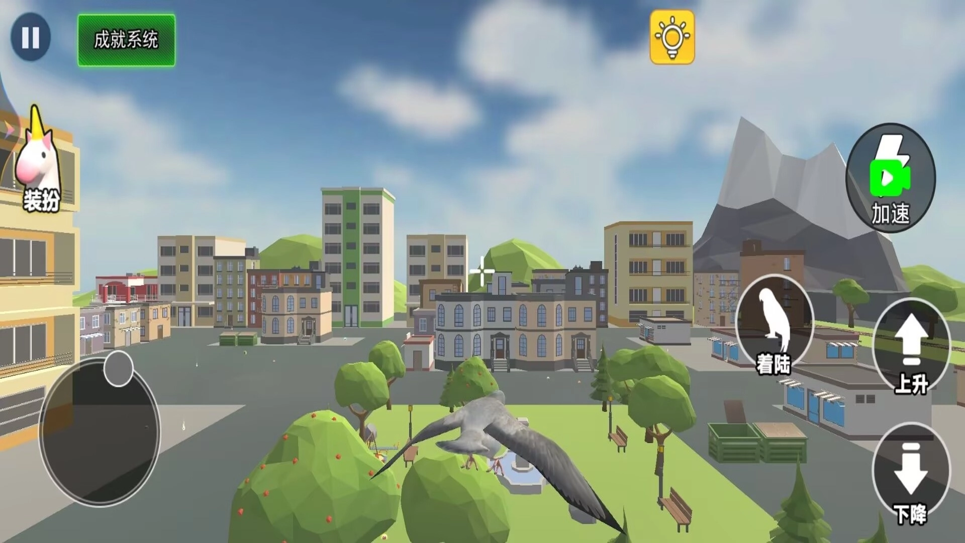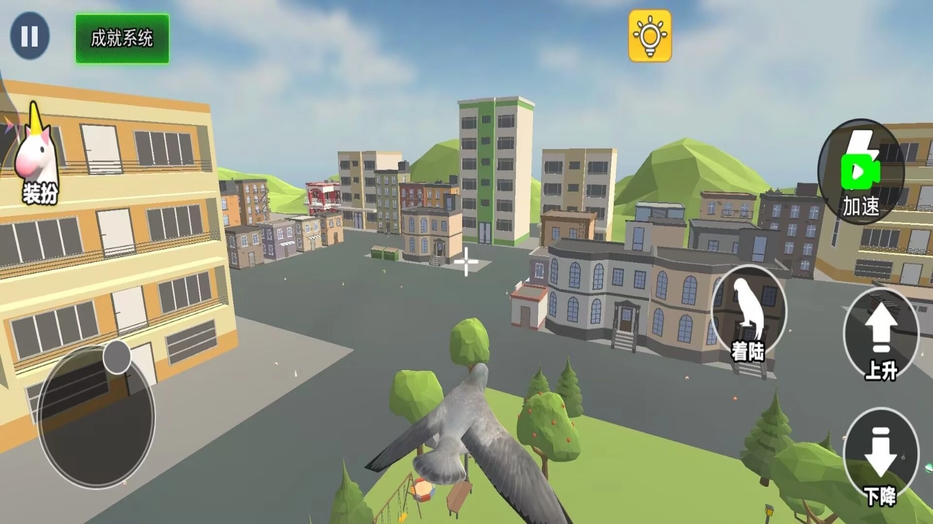 核心玩法是开放式的城市飞行探索。玩家要操控鸽子在街道、公园、广场等不同区域自由穿梭,接取并完成各类情境任务。