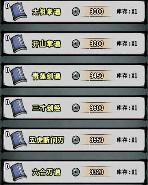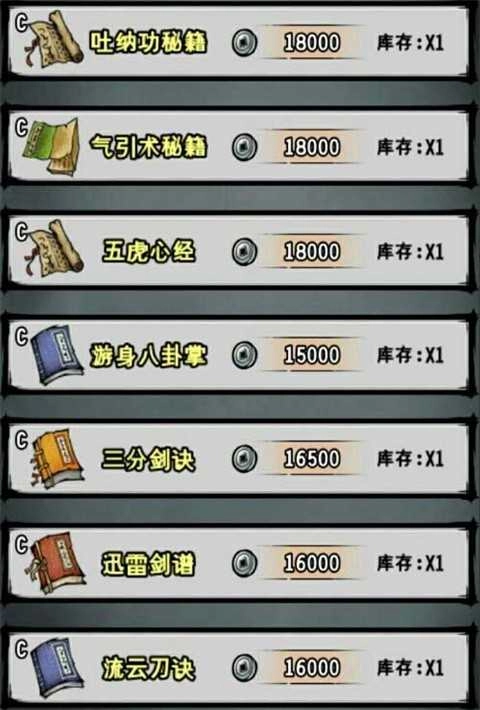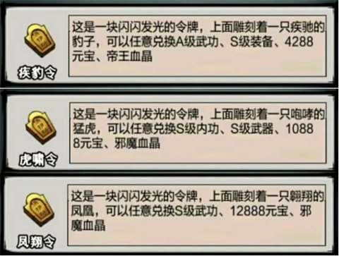 PS:所有的A级武功,S级武功,以及S级内功都可以用令牌换取---疾豹令可以兑换任意A级武功、虎啸令可以兑换任意S级内功、凤翔令可以兑换任意S级武功。