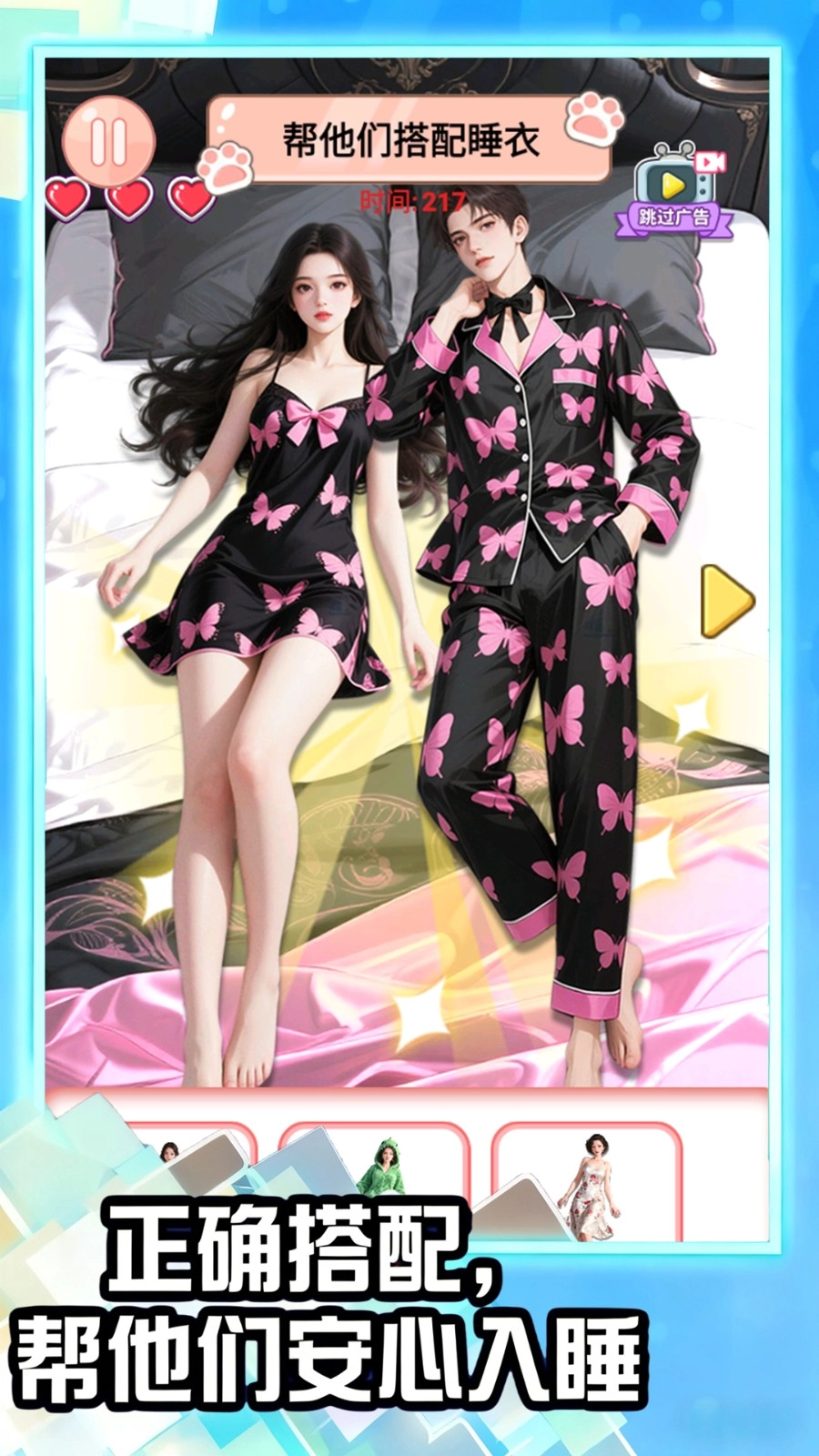 在琳琅满目的各式睡衣里,为情侣挑选款式、风格相契合的睡衣组合,完成搭配任务。