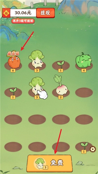 1、进入游戏后,点击下方的按钮即可根据当前作物的最高等级,随机获得一颗作物。