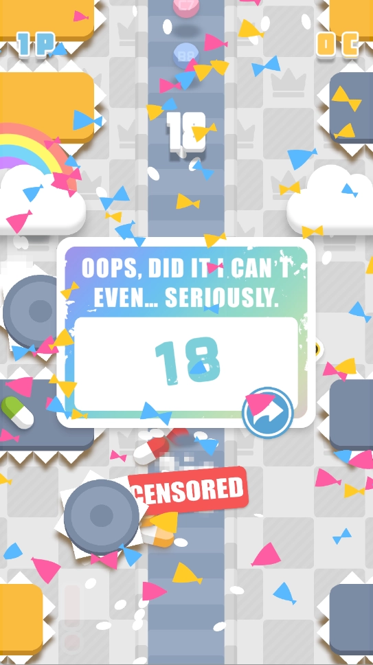 进行操作时务必小心谨慎,一旦角色撞到障碍物就会导致失败,游戏结束后会马上展示你这一局得到的最终分数。