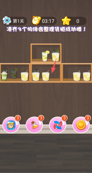 按照“凑齐3个相同物品就能整理”的规则,留意货架上饮品的摆放情况,优先把同类型的饮品移动到一起,借助滑动操作使3个相同的饮品归位。
