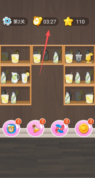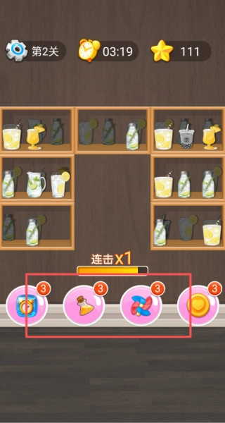 留意界面顶部的计时显示和星级进度条,在限定时间里尽量完成更多消除动作,还要关注货架上饮品摆放位置的变动,随时调整滑动的方式方法。