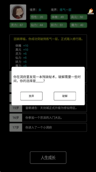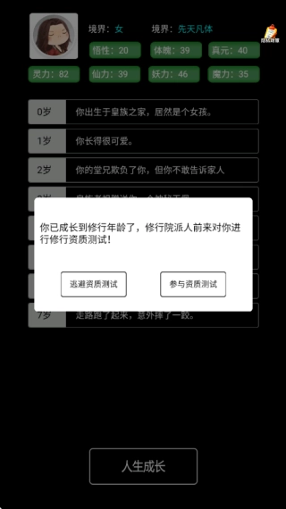 如图所示,每位玩家都会得到不同的任务设定,点击画面下方的“人生成长”按钮就能开启故事,过程中会随机出现各种抉择。