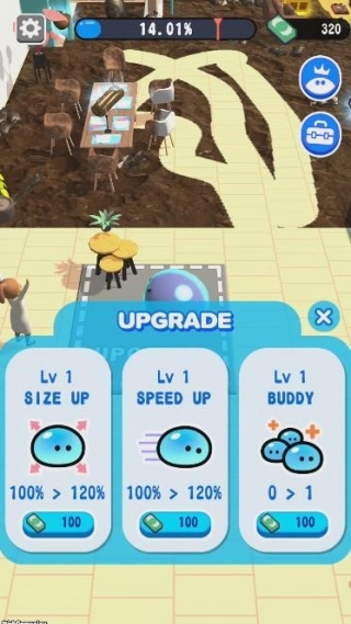 清洁工作完成后,收集到的金钱能够用来购买升级道具,使史莱姆的体型变得更大,力量也更强。
