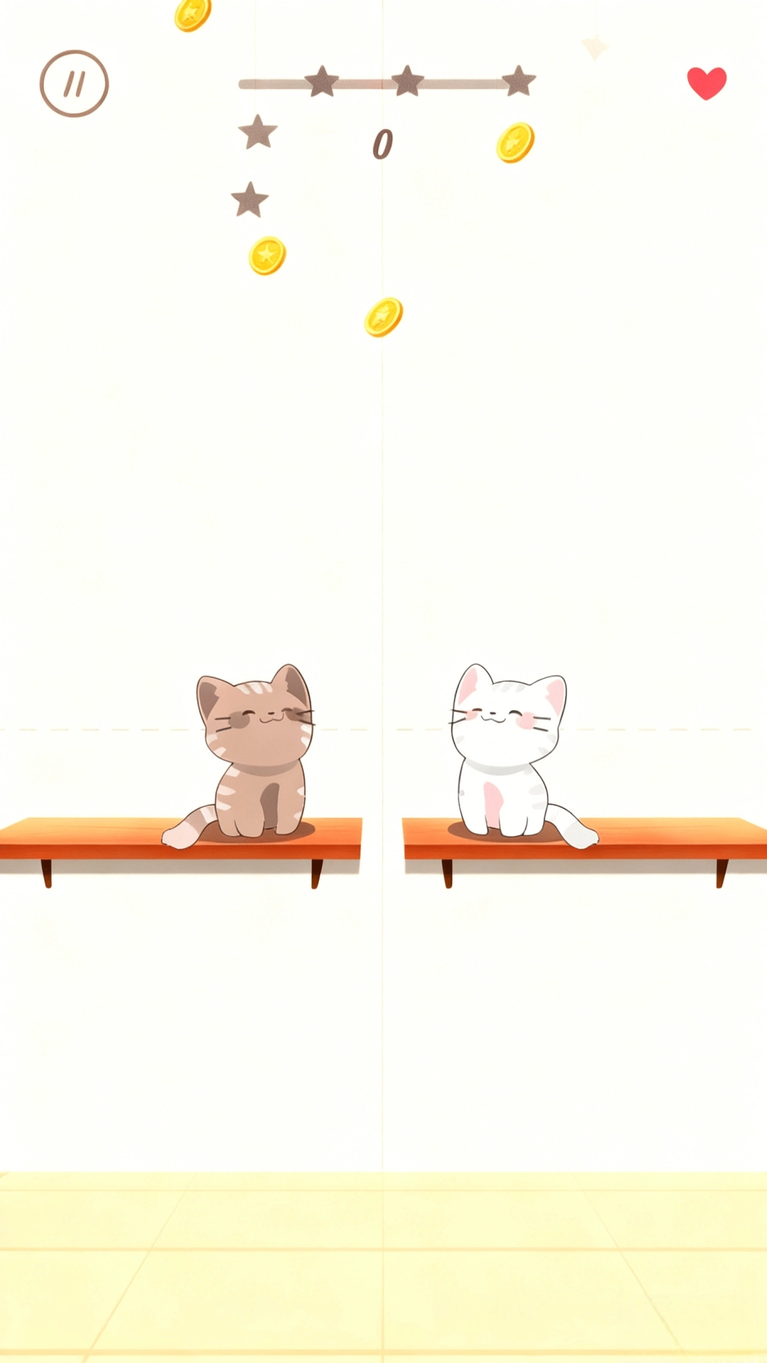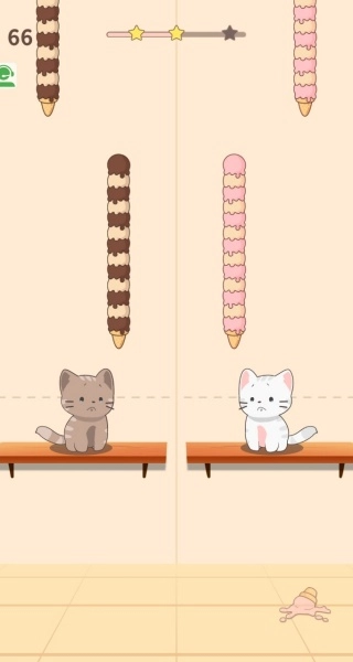 专注观察屏幕左右两侧掉落的甜筒,通过精准操作控制猫咪移动去接住它们来积累分数,如果没能成功接住,就需要重新挑战当前的关卡进度。