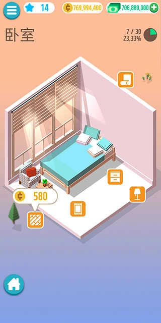 可解锁多个房间,自由选择家具进行布置,打造个性化风格。