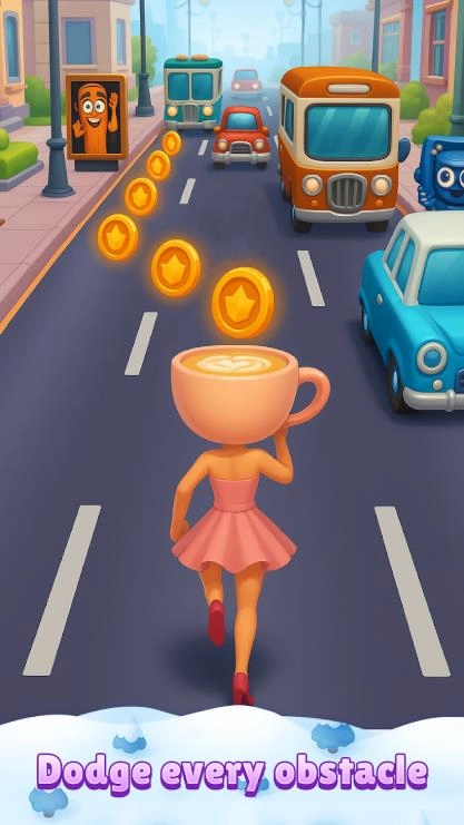 这绝非寻常的街头追逐,而是一场全然释放自我的超现实狂欢。从疾驰的列车顶部到咖啡杯搭建的舞台,从鳄鱼轰炸机的突袭到能跳芭蕾的咖啡杯少女,每一回奔跑都汇聚着新的梗与笑料。总而言之,这款游戏不只是跑酷,它更像一场脑洞大开的盛宴。