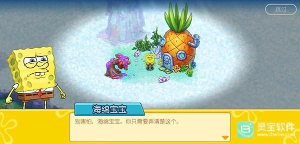2、进入游戏剧情,我们可以知道由于海底周围有非常多的果酱,玩家需要清理,不想知晓的可以点击右上角跳过;