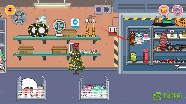 2、里面可以看到有一个卷帘门,打开他里面就有一套特别精美的衣服,粉色礼服蓝色洛丽塔等。
