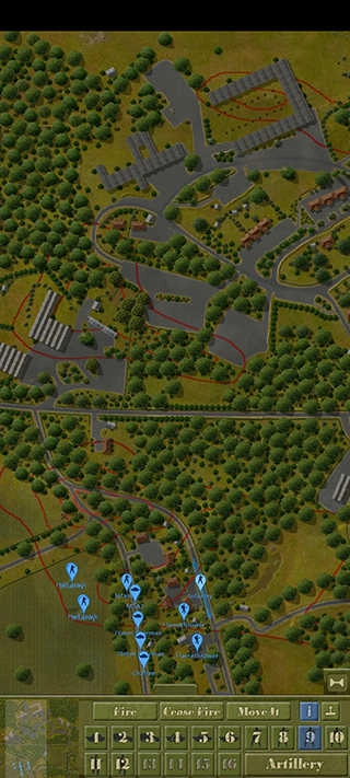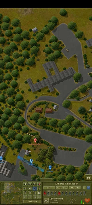 4、从图中能够看出,当前局势十分危急。我方的余部被敌方察觉,不过因为身处复杂的丛林环境中,并未遭到交叉火力的压制,所以我决定命令他们强行发起进攻,同时派遣M5A1予以支援。地图最左侧的机械化步兵则执行迂回穿插任务,该机械化步兵团的位置四周有遮蔽物环绕,无需担忧会受到火力攻击。