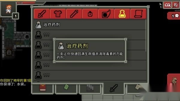 4、不要急着使用未知的药水把多余的药水卷轴放远一些(注意药水能摔碎冻碎用放下不要按扔出),在水边喝药防止液火药水烧伤血 ,也别站在水上喝这样能防止冰冻药水冻伤人。