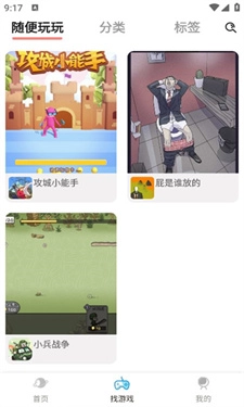3、还可以点击下方的【找游戏】页面,里面设有【随便玩玩】、【分类】和【标签】这些选项。