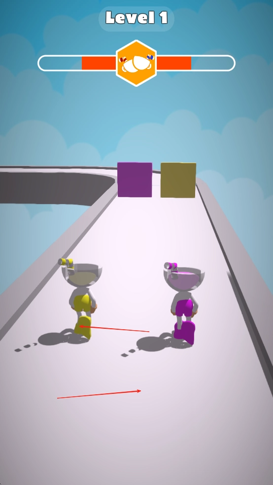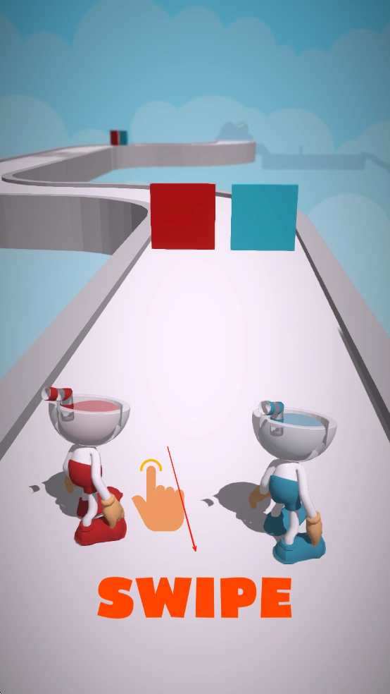 《水杯头跑酷》是一款风格独特又趣味十足的休闲跑酷精品,能让玩家开启一段惊喜与挑战并存的奇妙冒险。两位头顶不同颜色颜料的水杯主角格外引人注目,它们无需玩家手动操控前进,就会充满活力地在色彩缤纷的赛道上自动奔跑。赛道上会不定时出现颜料池,这就需要玩家快速反应、眼疾手快地做出判断,精准控制水杯,使其头顶的颜料与即将到达的颜料池颜色完美对应。