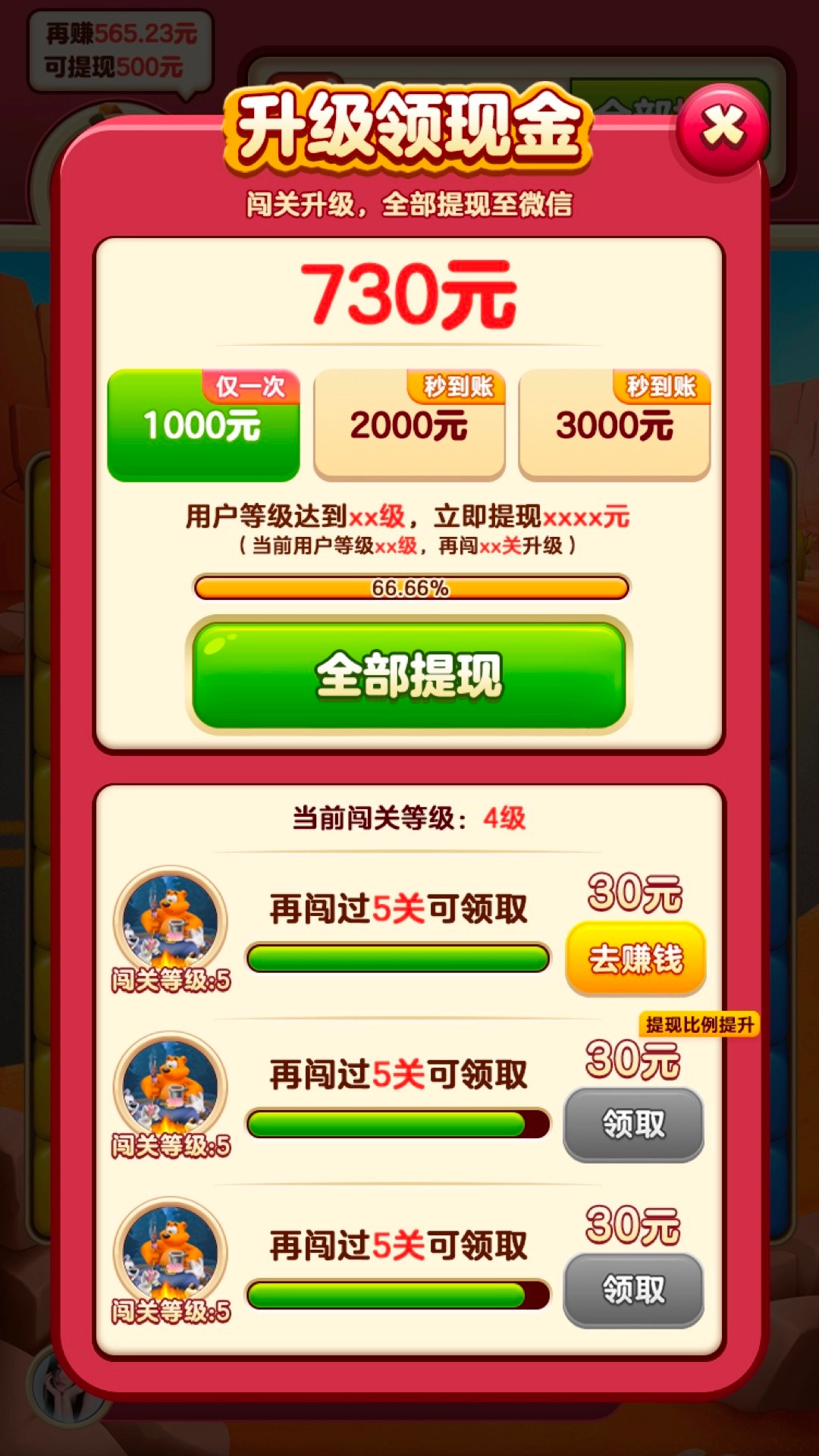 1、游戏新人通过第一关后直接就能领66元红包;