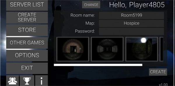 1、首先我们进入瘦长鬼影计划online,游戏界面第一个是房间大厅,第二个是创建房间,第三个是道具购买,其他可以不管!