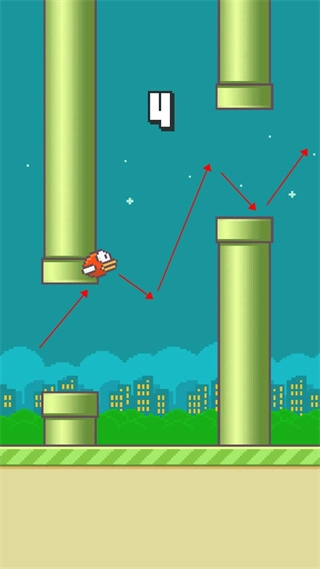 小鸟的跳跃是个锯齿状,靠点击屏幕来获得上飞的力量。你知道路线是锯齿状的,那么你对小鸟的下一步就有了预期和判断,这样就不至于掉在地上或者是撞向柱子。要想过更多关卡,就必须在上下柱子之间起跳,起跳是需要与下面柱子隔一定距离。