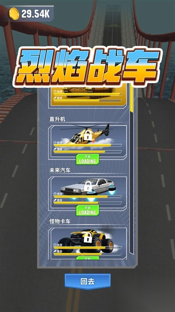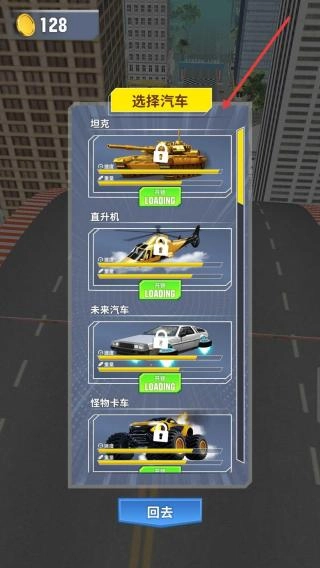 在【选择汽车】页面,你可以解锁坦克、直升机等载具,挑选心仪的载具参加比赛。