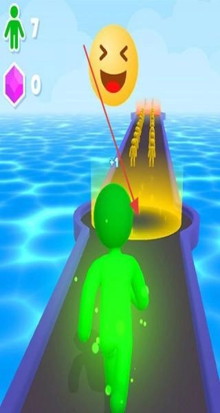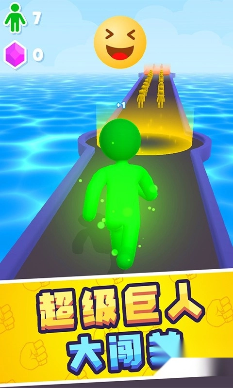 进入游戏后,控制绿色巨人在水上赛道上奔跑,注意路径中的表情增益效果(比如笑脸区域),通过这些区域就能获得强化。