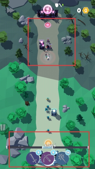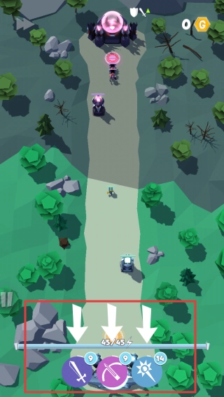 在战斗场景中,使用下方提供的剑、斧、法球三种技能,按照箭头指示的方向部署单位,让它们沿着指定路线向前推进,攻击敌方的建筑。