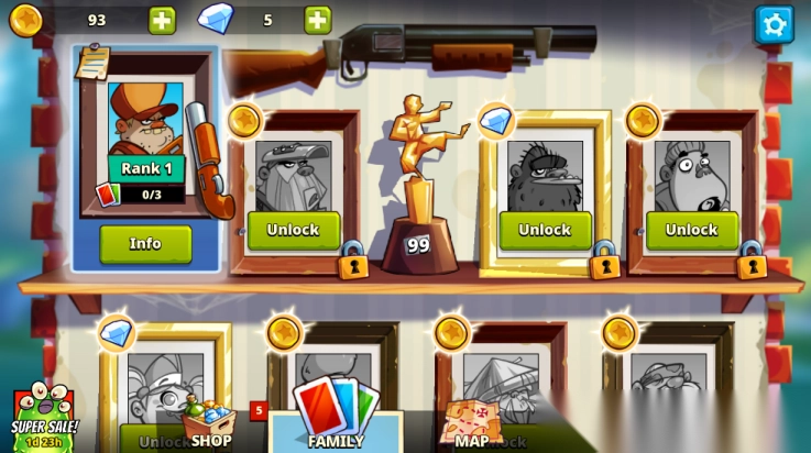 进入游戏后,首先需要选择或解锁角色;接着点击人物进入升级界面,在此界面中可以强化角色属性,同时解锁并更换武器,以此为守护沼泽做好准备。
