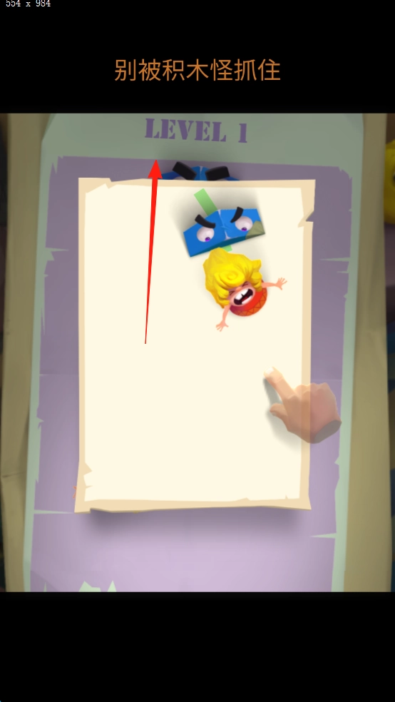 按住屏幕操控角色移动,在纸张搭建的场景中,避开积木怪的追击,努力从当前路径逃脱。