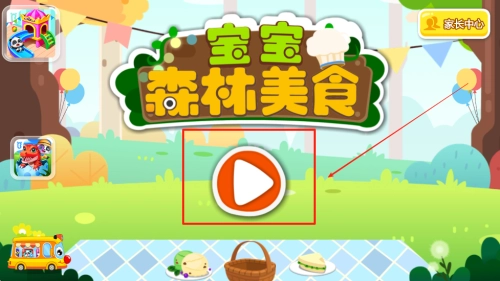 轻触屏幕中央即可启动游戏,带领宝宝走进森林美食派对。