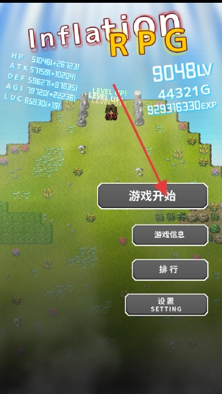 在游戏启动界面点击“游戏开始”按钮后,即可进入冒险模式。此时界面会展示角色的各项属性,包括生命值(HP)、攻击力(ATK)等,以及当前等级(9048级)。此外,还能通过界面上的选项查看“游戏信息”“排行榜”和“设置”等内容。