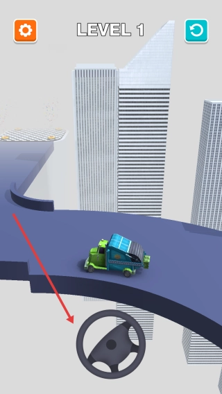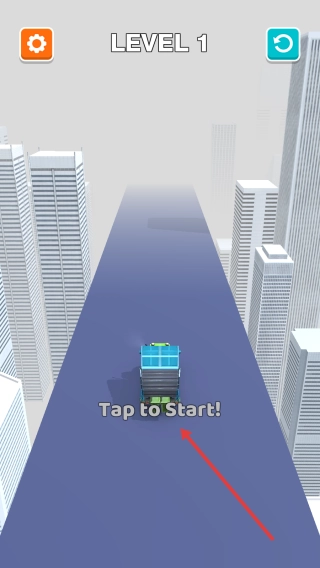 点击“Tap to Start”开始游戏,操控卡车在高空赛道上行驶,通过虚拟方向盘控制方向,注意避免坠落。