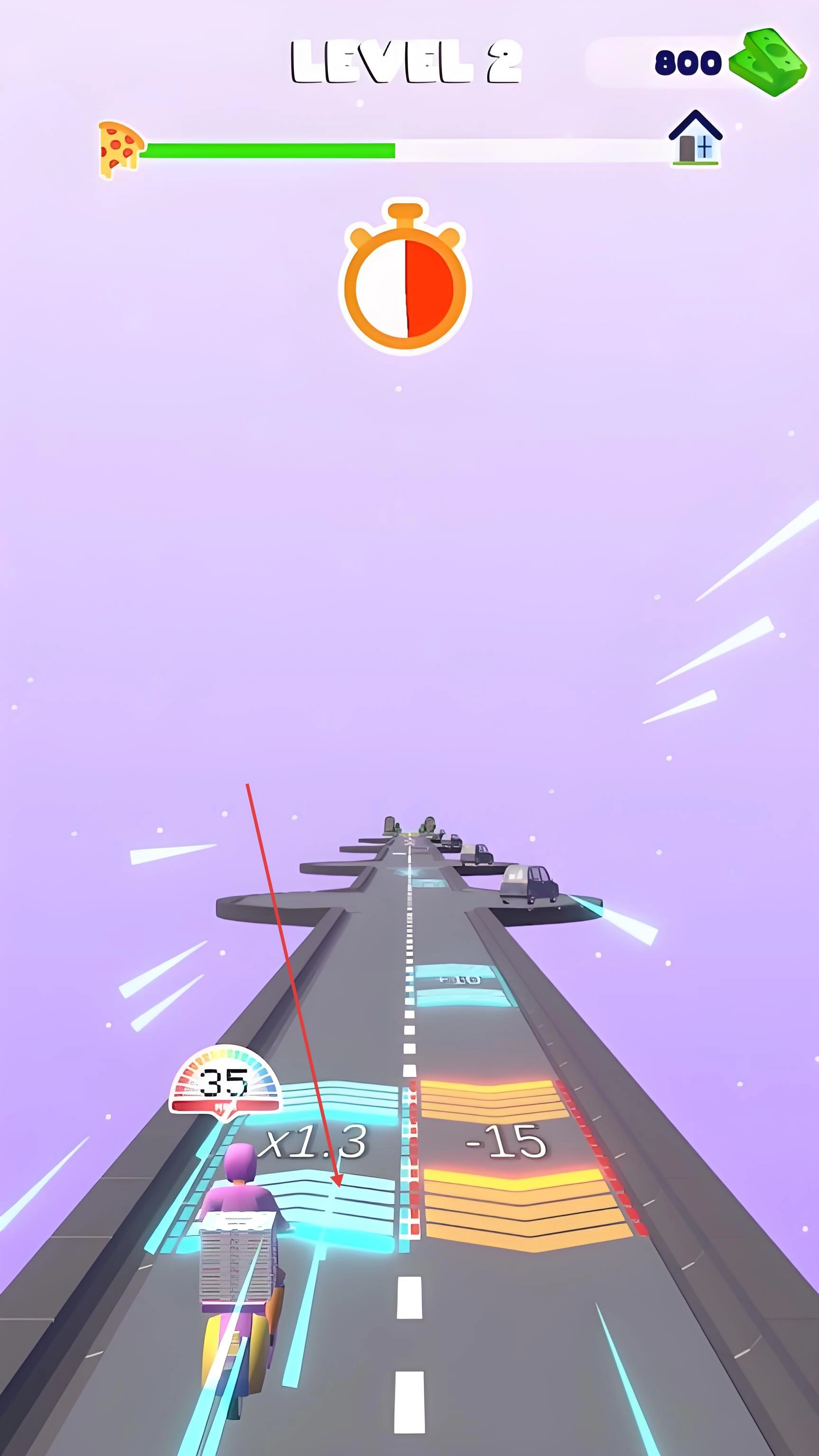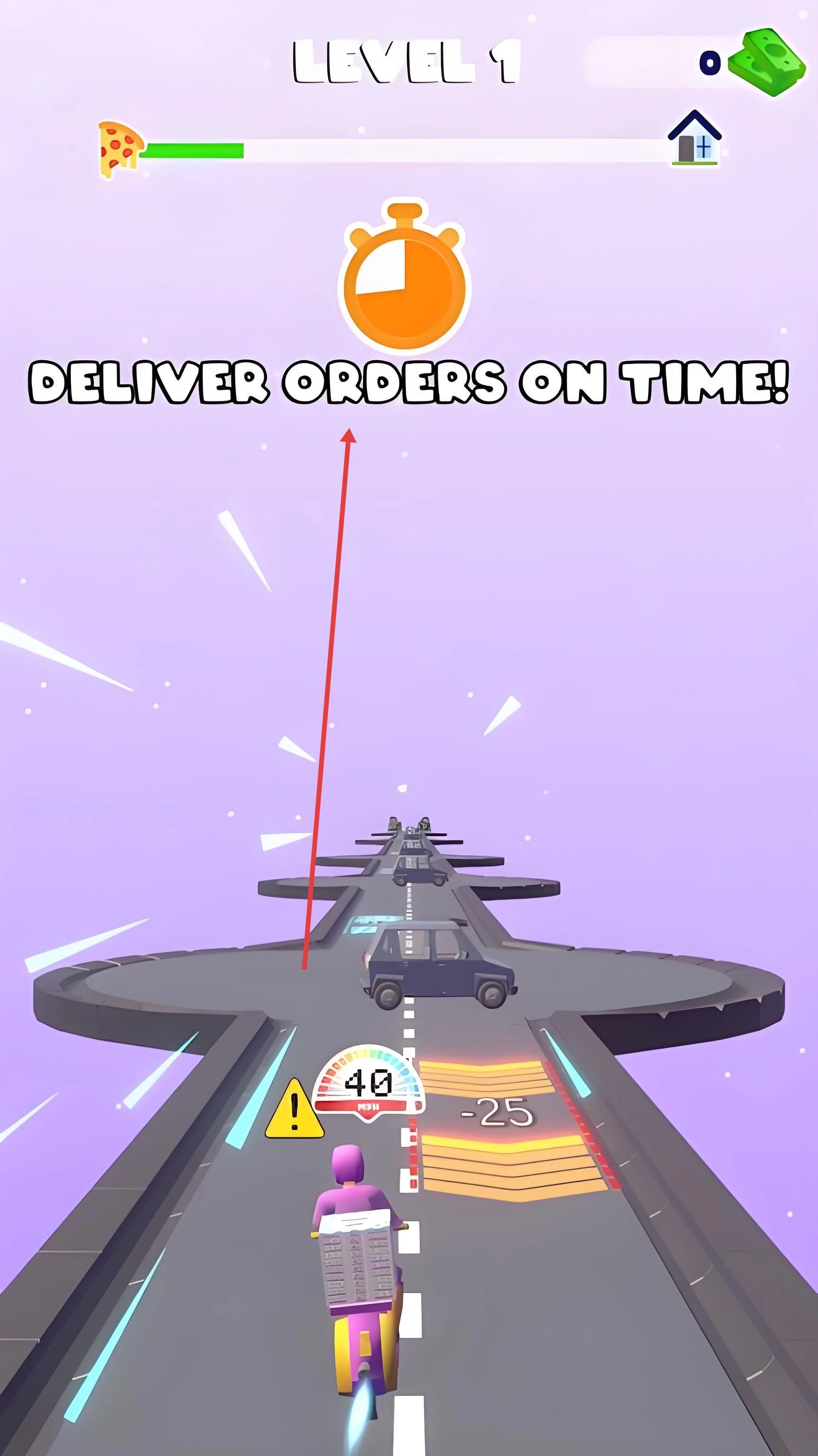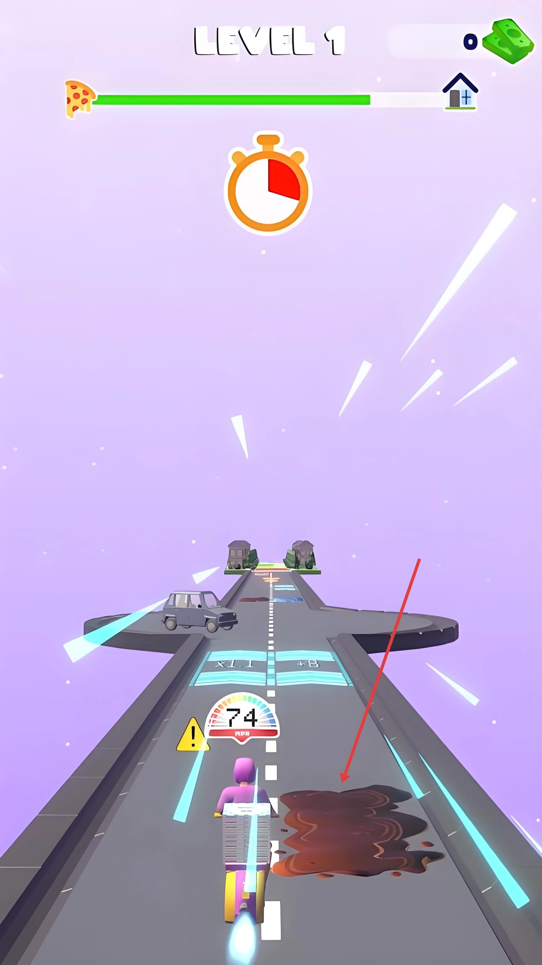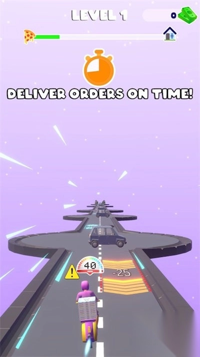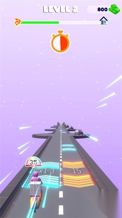 在奔跑时要留意路面上的标识:蓝色的加速带能让移动速度提升三成,黄色的近路箭头会指引你走更短的捷径;碰到红色餐盒图标时,得精准地把它捡起来,这样才能累积订单的完成度,另外还要注意左上角的倒计时。