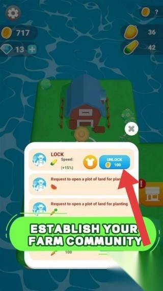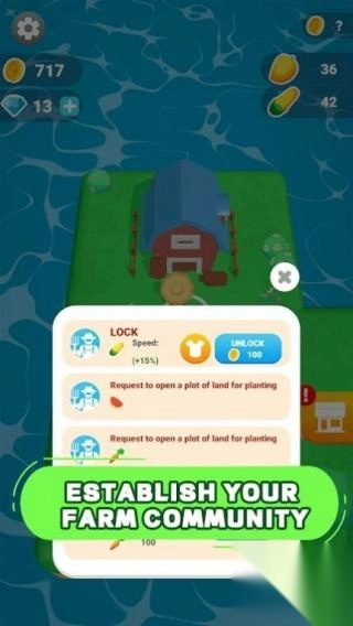 画面展示的是与农场相关的界面,配有“ESTABLISH YOUR FARM COMMUNITY(建立你的农场社区)”的引导语,同时设有解锁土地等功能选项,玩家能够体验农场经营、社区建设之类的玩法。