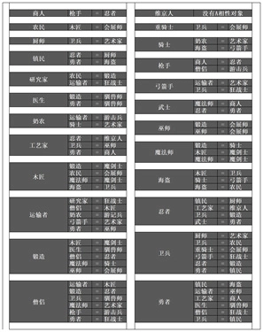 2、工匠、商人、僧侣、农民、巫师、枪手、忍者、武士这些职业的父母职业搭配情况如下: