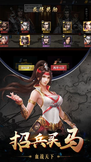 寻访人才、网罗三国名将,弓骑步等多种兵种搭配组合,魏蜀吴群雄四大阵容、多重品级搭配、武将缘分羁绊,衍生海量特色组合,助你纵横乱世、驰骋沙场!