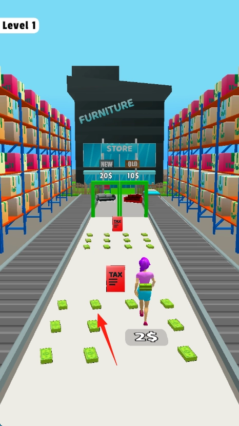 操控紫色头发的角色,沿着通道奔跑,按照箭头的指引,避开TAX障碍,收集地面上的美元钞票。
