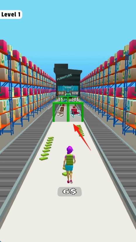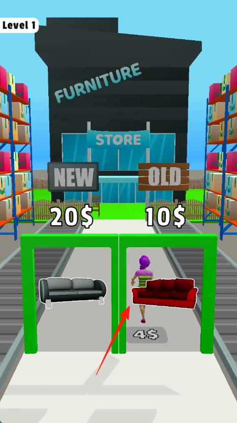 走到商店门口,按照箭头的指引,挑选对应的家具通道(比如红色沙发门),进去完成第一关,就能得到收益。