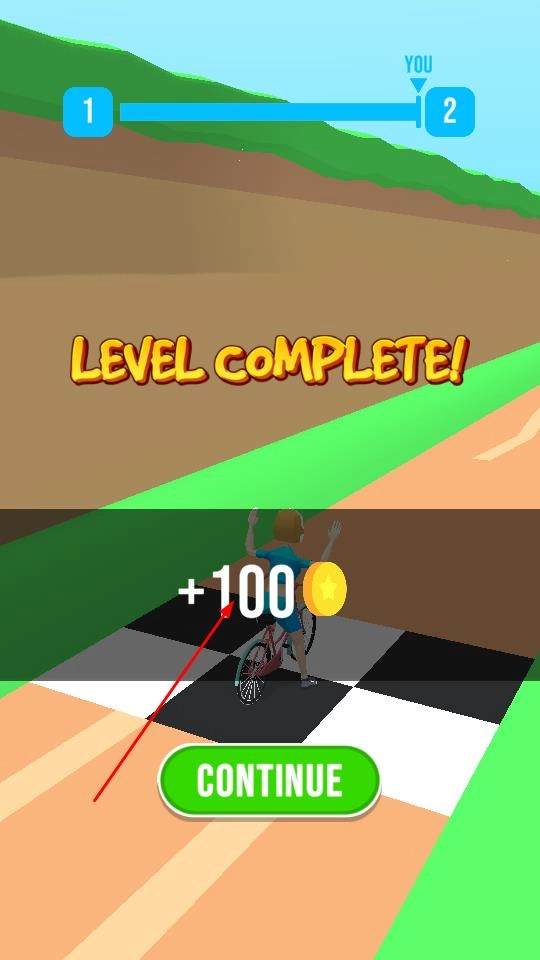 到达终点后会触发LEVEL COMPLETE,领取金币奖励,点击CONTINUE就能进入下一关,解锁全新赛道,去挑战难度更高的骑行。