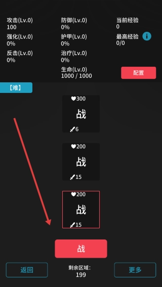 角色初始的攻击、防御等属性均为0级,生命值为1000。选择下方带有“战”字的单位,点击红色的“战”按钮,即可开启战斗。