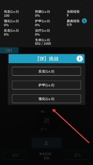 战斗结束后会进入饼挑战界面,此时经验值变为9/9,界面上设有反击、护甲、强化三个选项,选择强化即可提升对应的属性。