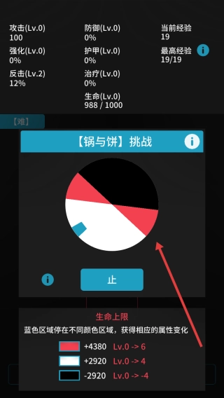 参与锅与饼挑战时,饼图里不同颜色的区域对应着不同的属性变化,点击相应区域,角色的生命等属性就会发生改变,从而帮助角色变得更强。