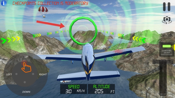 在游戏里驾驶飞机穿过绿色圆环检查点,借助左下角的按键调整飞行方向,跟着系统的提示来操作。