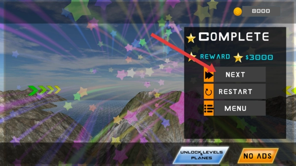 游戏关卡完成后,需点击NEXT进入下一关,领取当前关卡的奖励并继续挑战下一关的飞行任务。