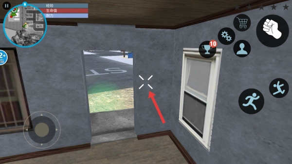 在房屋内的场景中,通过左侧摇杆控制移动,右侧按键可用于攻击或奔跑,按照小地图左上角的指引行动,起点为初始安全区域。
